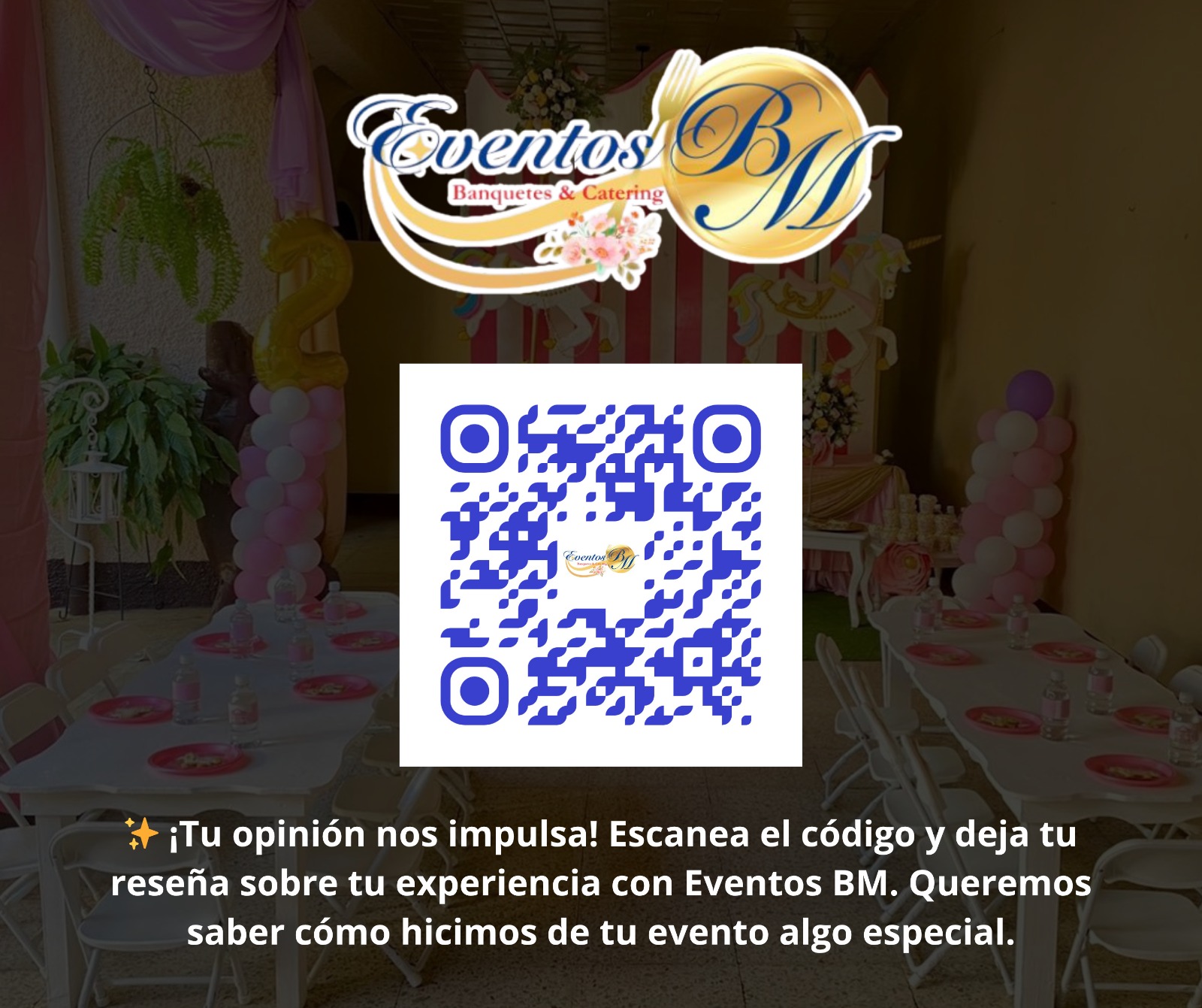 Eventos BM ofrece servicios profesionales de banquetes y catering para todo tipo de celebraciones: bodas, cumpleaños, eventos corporativos y más. Nos especializamos en brindar atención personalizada, comida de calidad y una presentación impecable que hará de tu evento una experiencia inolvidable.